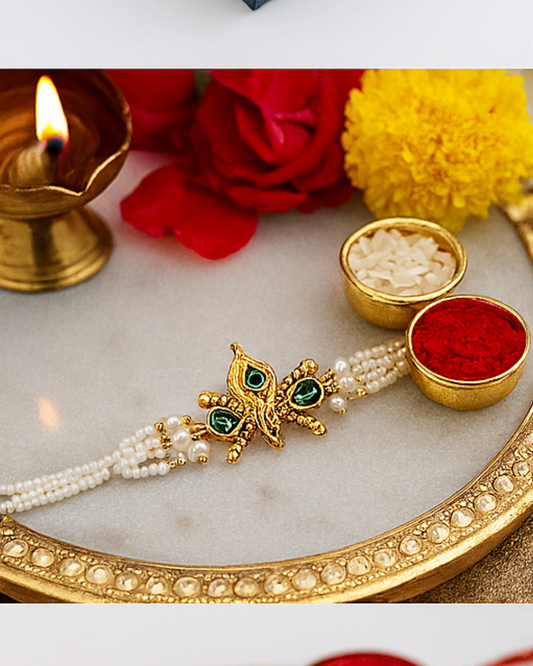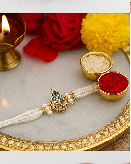 Handmade Divine Peacock Feather Rakhi with Free Chawal & Kumkum